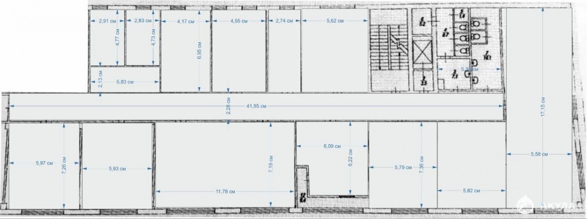 кабинетная планировка — 12 кабинетов (каждый можно разделить на два — площадь позволяет);