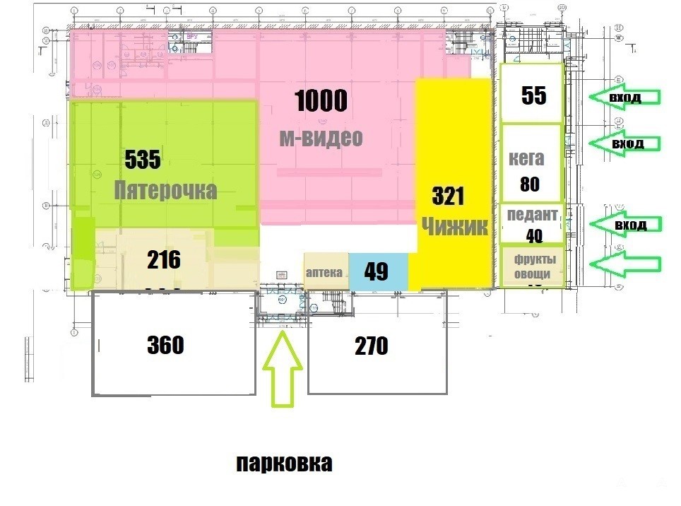 Якорные арендаторы: М-Видео, Чижик, Пятерочка, Будь Здоров.