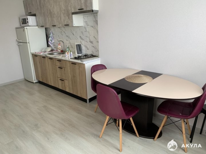 Полностью оборудованная кухня: холодильник, плита с 4 конфорками, духовка, микроволновка, электрический чайник, небольшой набор посуды.