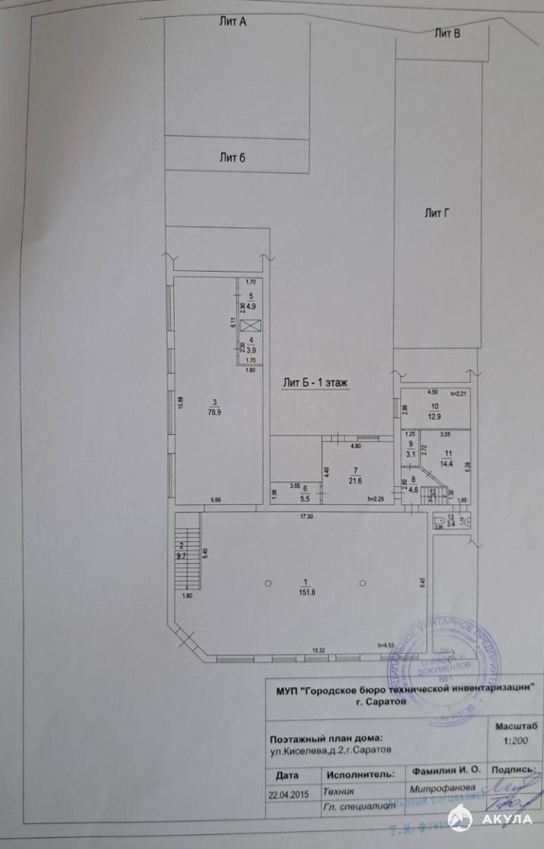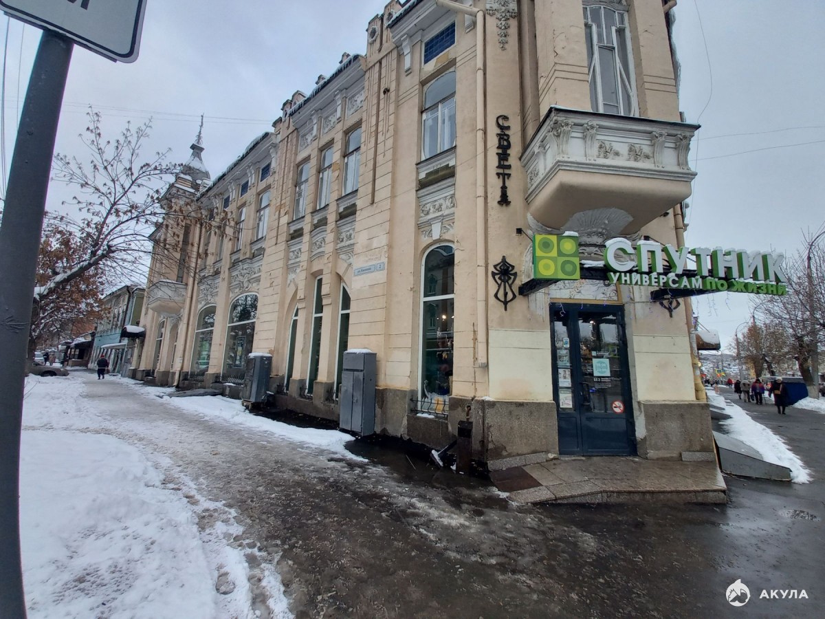 Общая площадь 640 кв.м. : 1 этаж - 316, 8 кв.м., антресоль - 37, 9 кв.м., подвал - 286, 5 кв.м. Первый этаж используется как торговое помещение: в настоящий момент там расположен магазин «Спутник».