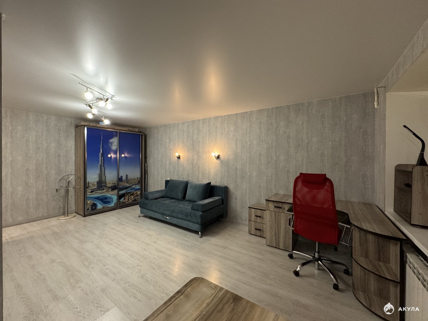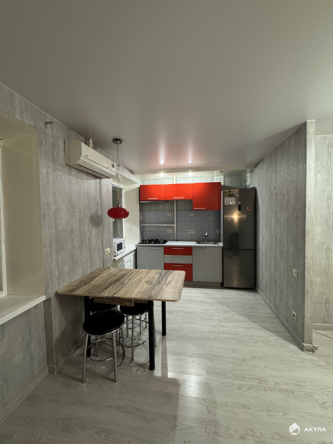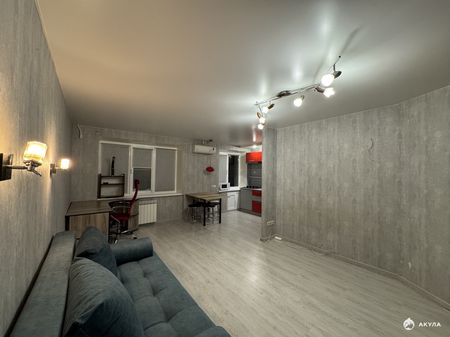 При продаже остается кухонный гарнитур с вытяжкой, холодильником, СВЧ. Вместительный шкаф, раскладной диван, обеденный и рабочий стол, кондиционер, стиральная машина.