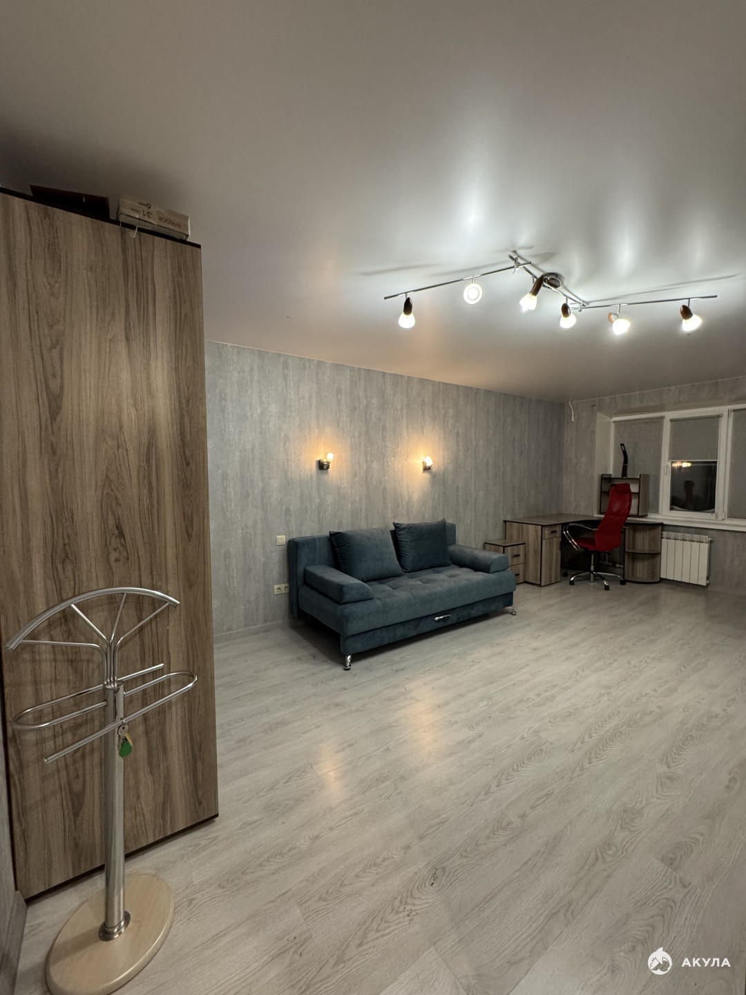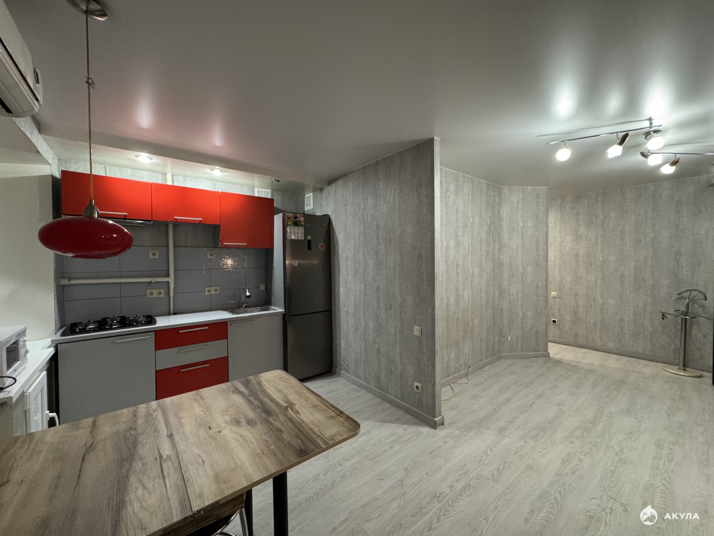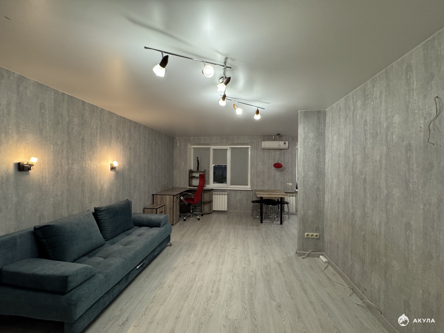 При продаже остается кухонный гарнитур с вытяжкой, холодильником, СВЧ. Вместительный шкаф, раскладной диван, обеденный и рабочий стол, кондиционер, стиральная машина.