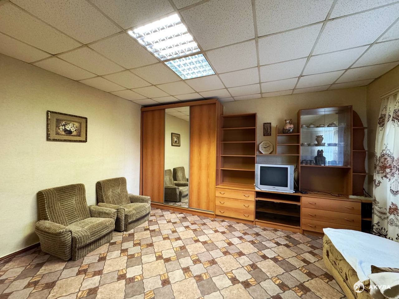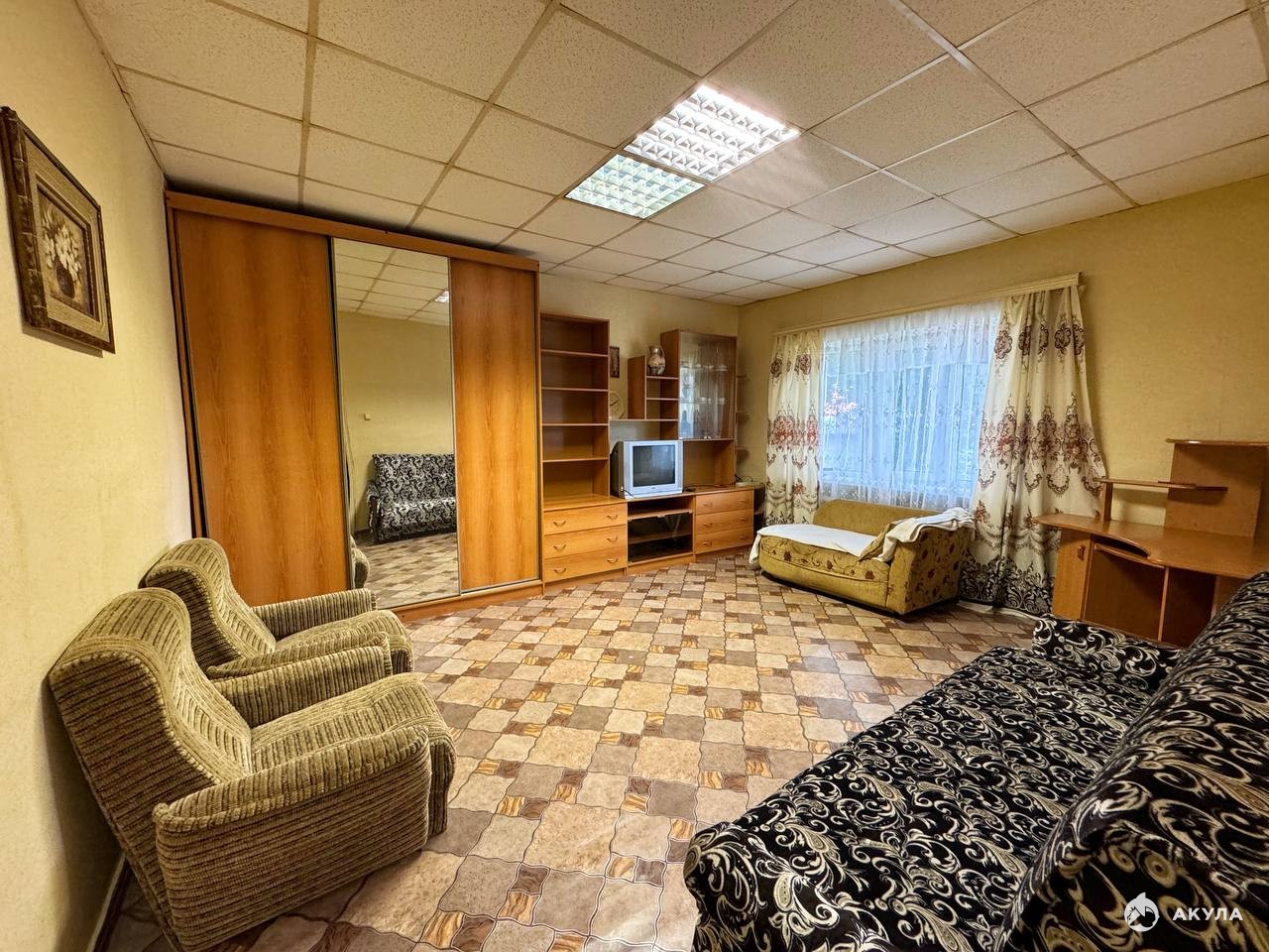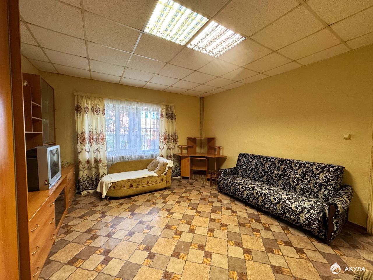 Площадь квартиры: 31, 5 кв. м, просторная комната с косметическим ремонтом, пластиковые окна, полностью обставлена мебелью и техникой все, что на фото остается в квартире. Можно заезжать и жить!