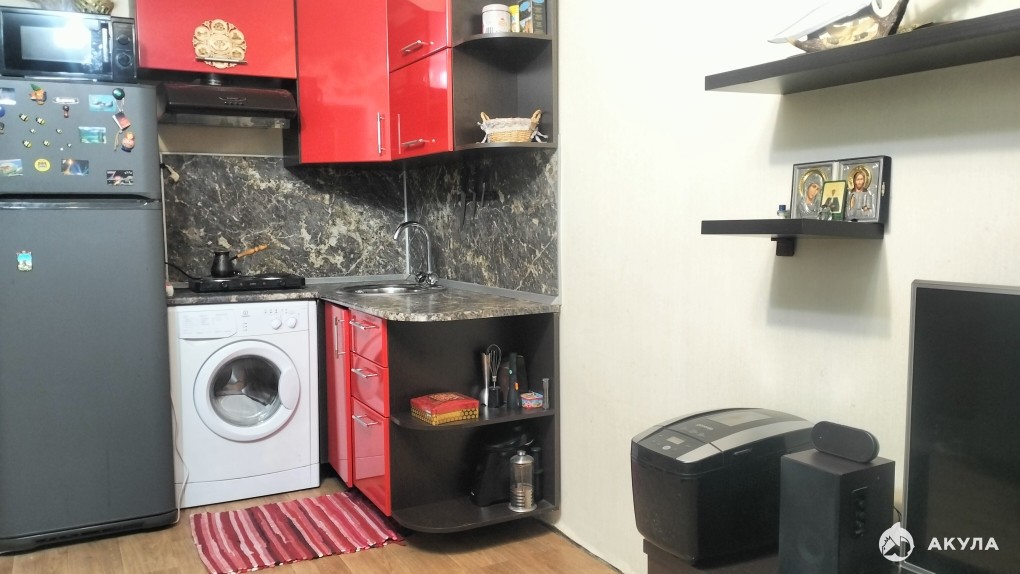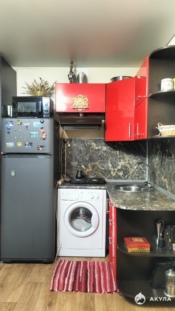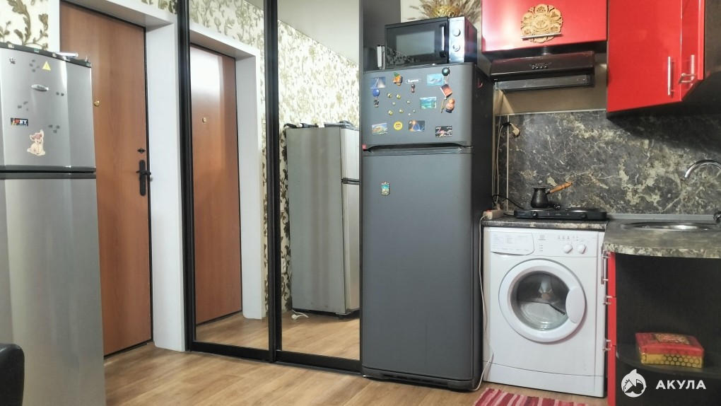 Выделена кухонная зона с гарнитуром. есть вся необходимая мебель и техника: удобный диван, шкаф-купе, холодильник, стиральная машинка, СВЧ-печь, телевизор, пылесос и др.