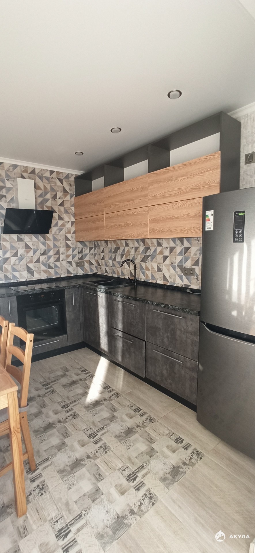 - кухня: кухонная мебель, обеденная группа стол и 4 стула, холодильник, варочная панель, духовой шкаф, вытяжка, СВЧ.
